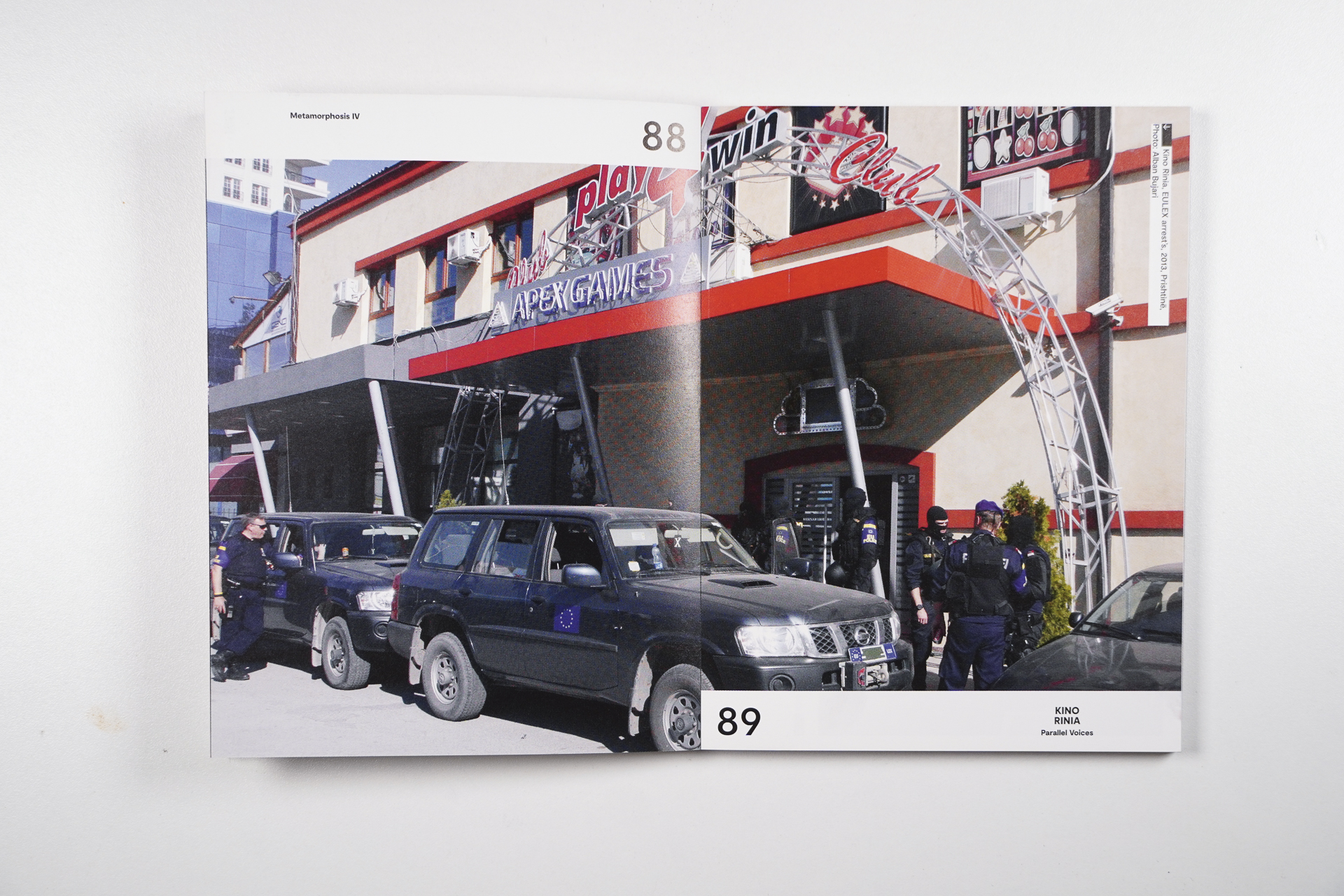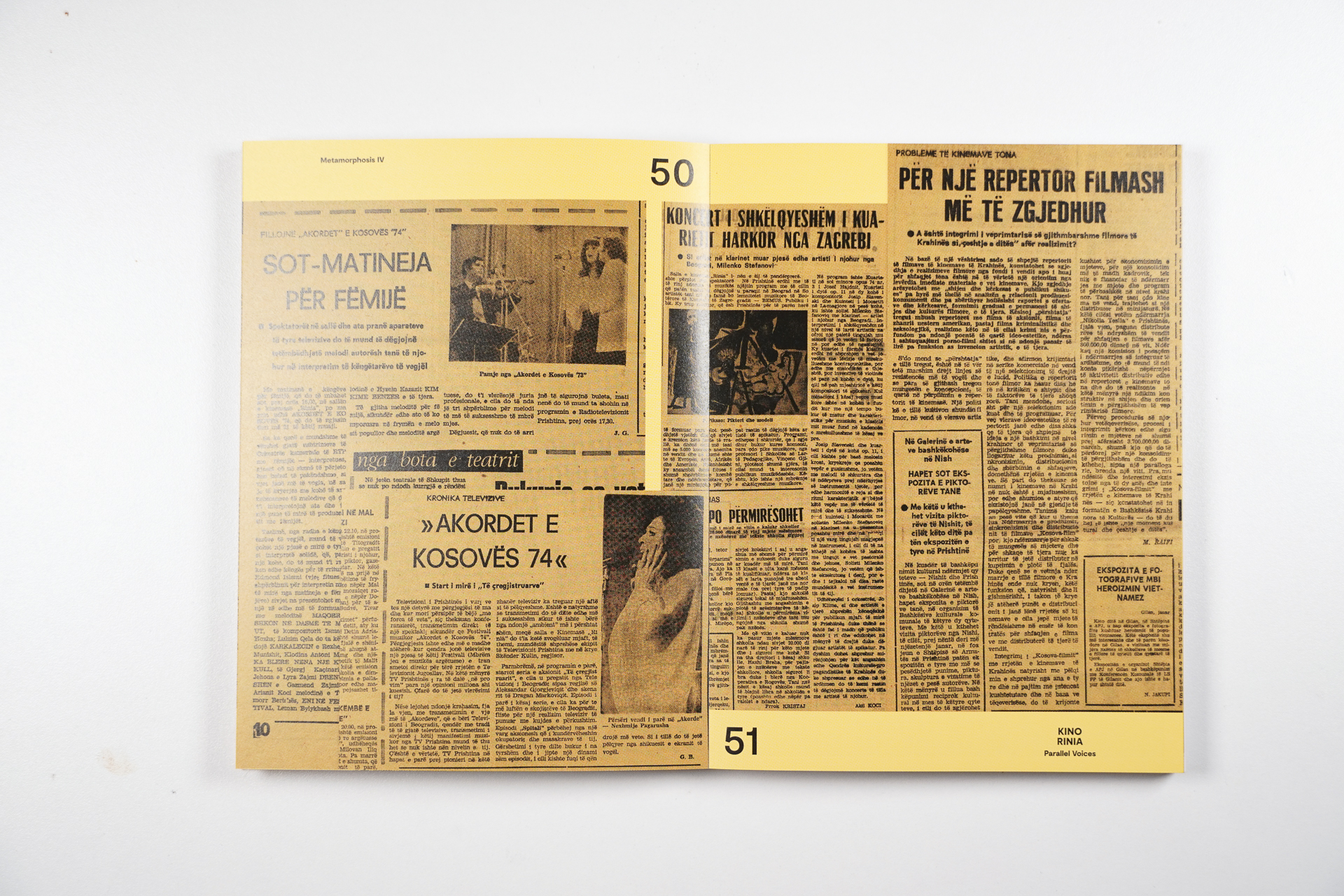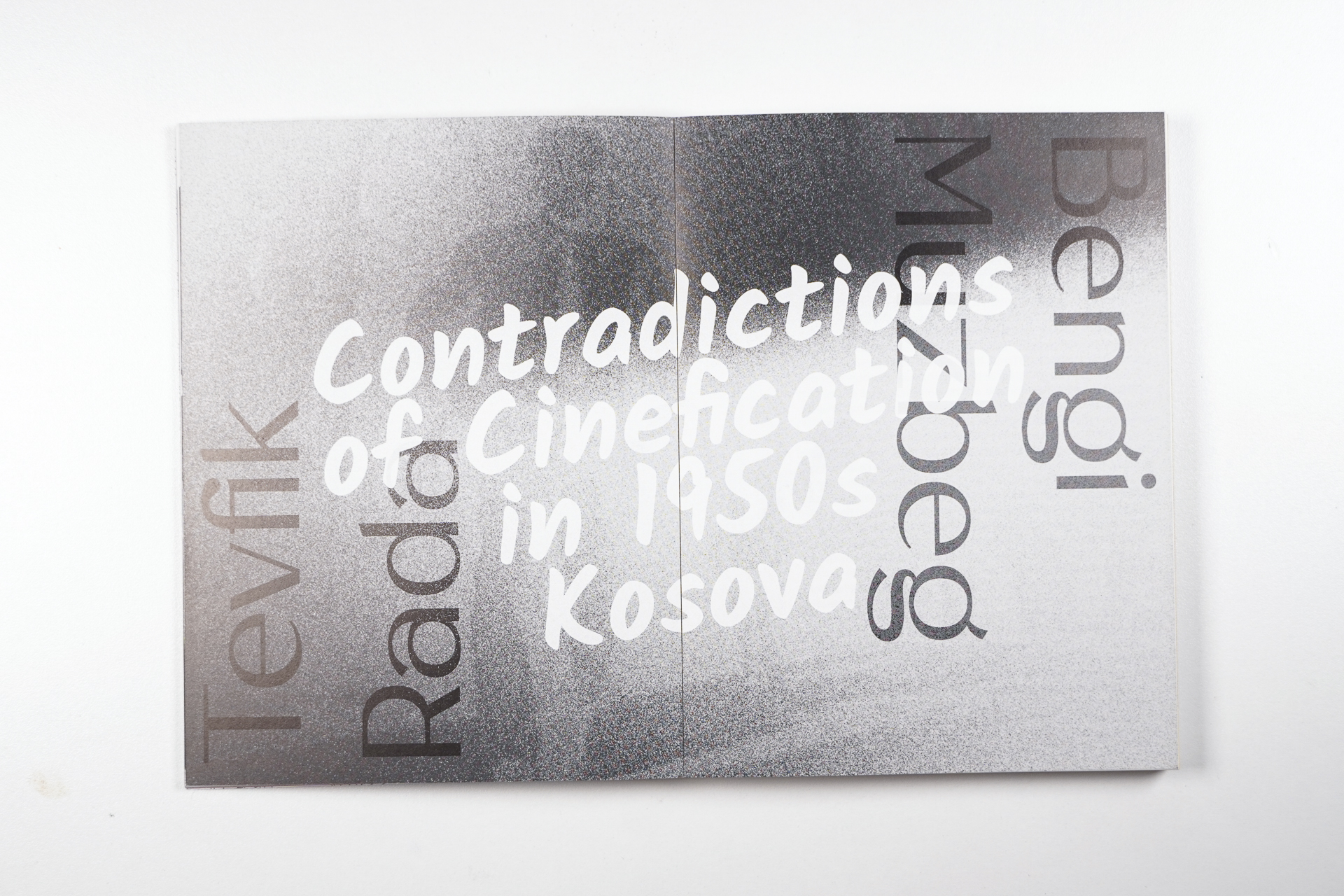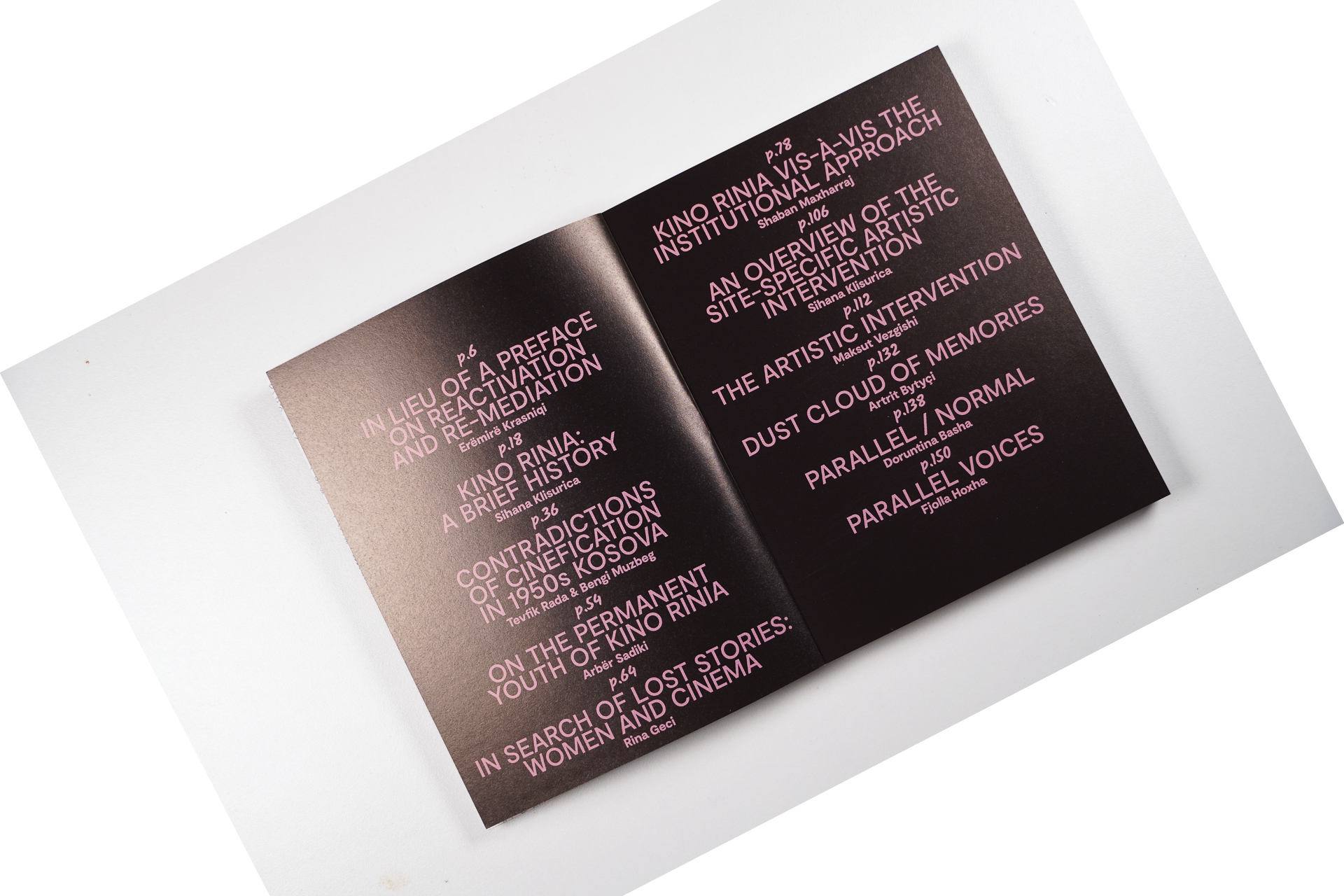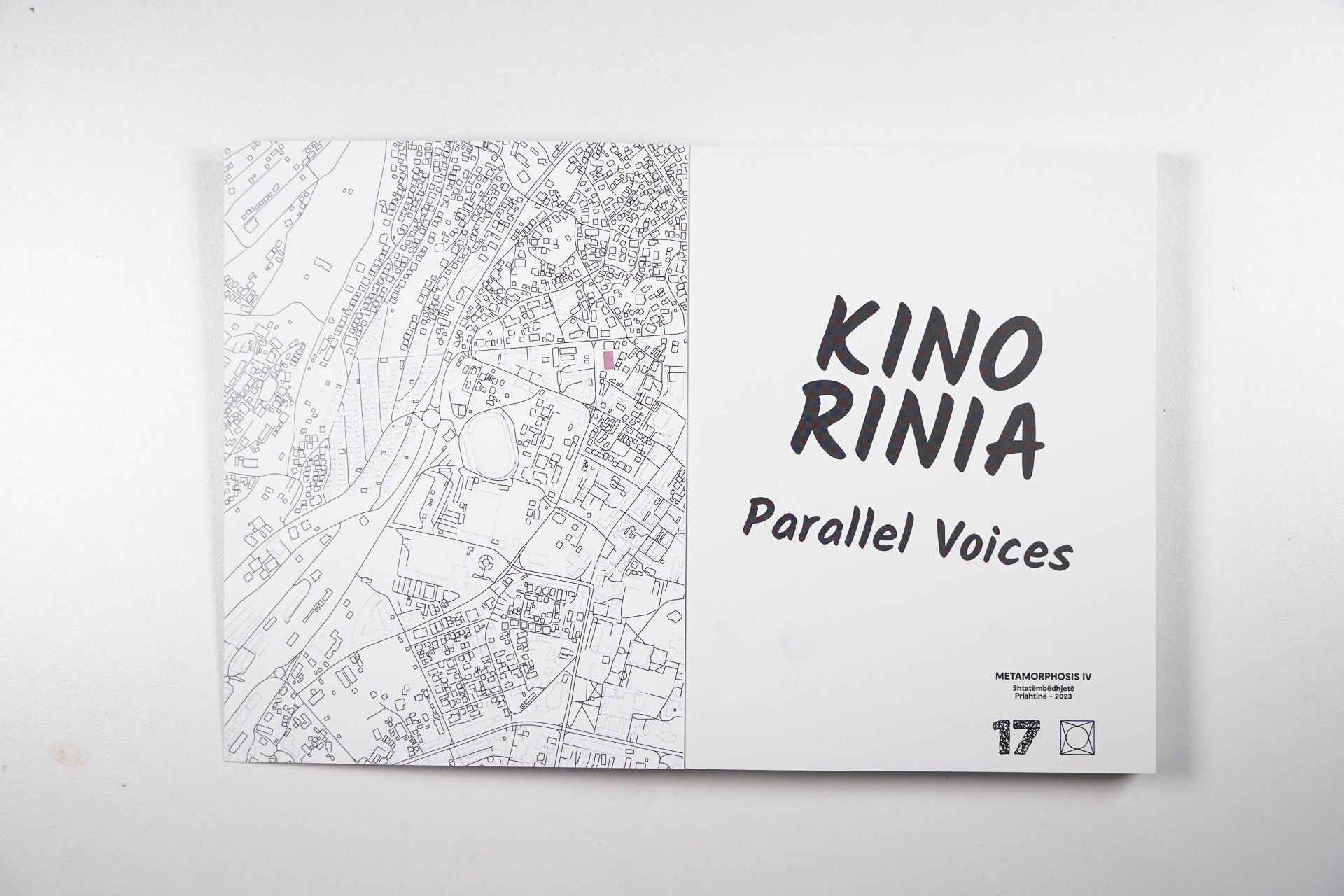 “Kino Rinia – Parallel Voices” is a publication in two parts. The first consists of commissioned texts that address Kino Rinia’s cultural and political heritage, while exploring public history and architectural theory more generally. The second part of the publication offers a detailed visual and textual documentation of “Parallel Voices,” a site-specific intervention at Kino Rinia by artist Maksut Vezgishi, which took place from September 7 to 9, 2021.